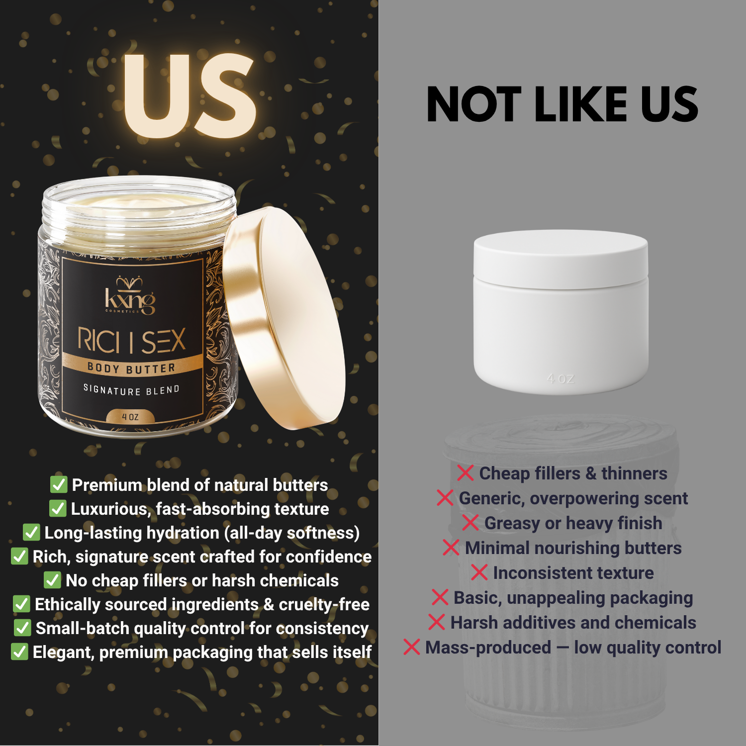 Our cruelty-free, vegan formula harnesses the power of organic botanicals to provide unparalleled moisturizing benefits. Whether you're looking for a daily body lotion, a deep nourishing serum, or a multi-purpose beauty solution, our body butter delivers exceptional results. Elevate your skincare routine with KXNG Cosmetics, where luxurious, organic body care meets the nourishing power of nature. Give your skin the royal treatment it deserves and experience the difference of our premium, all-natural formula.